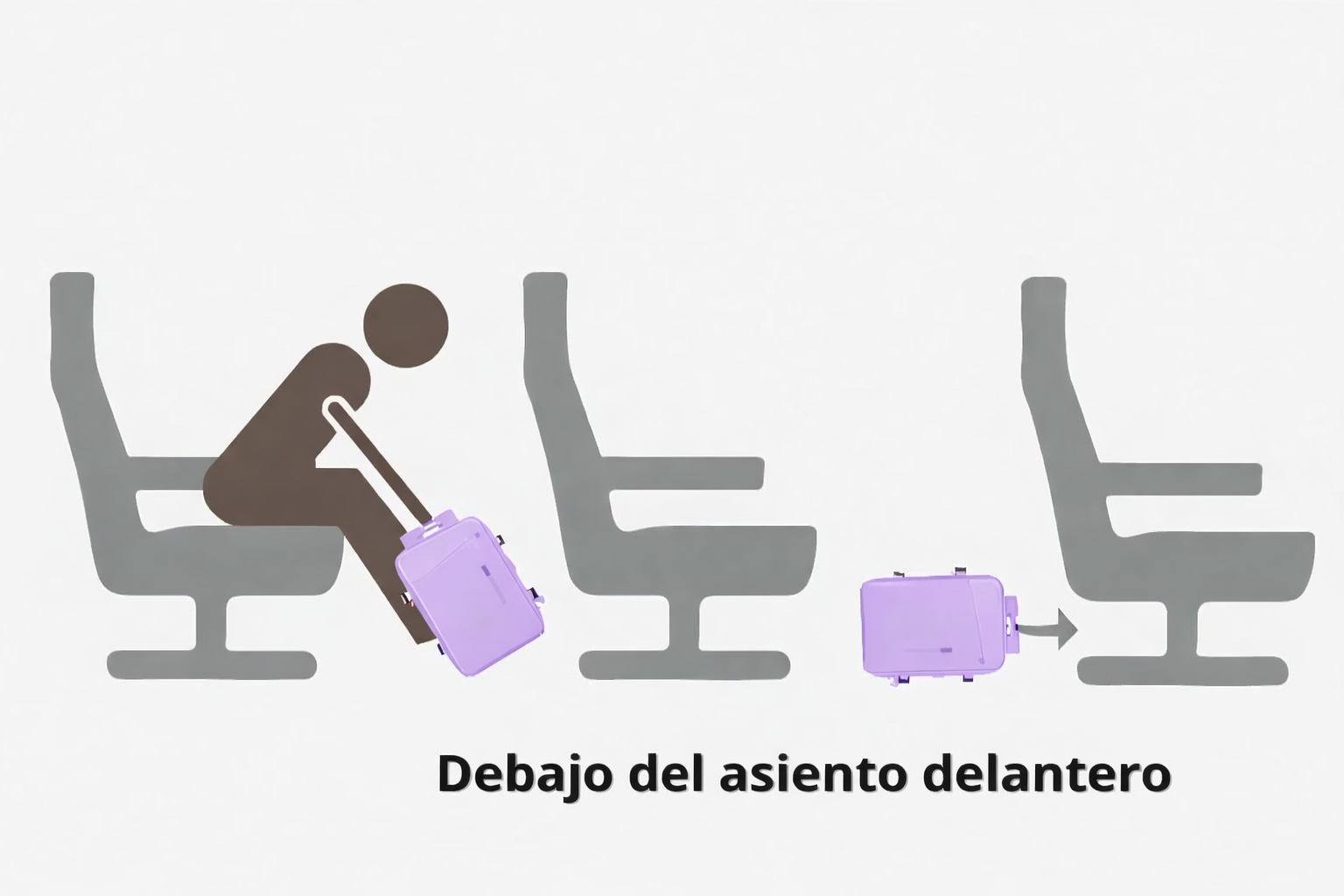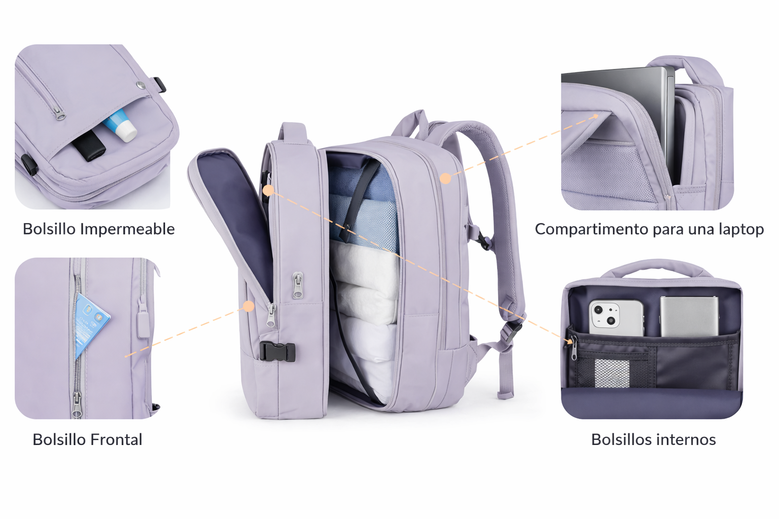 Mochila expandible e impermeable, diseñada para usarse como artículo personal y caber bajo el asiento del avión, sin pagar equipaje extra.